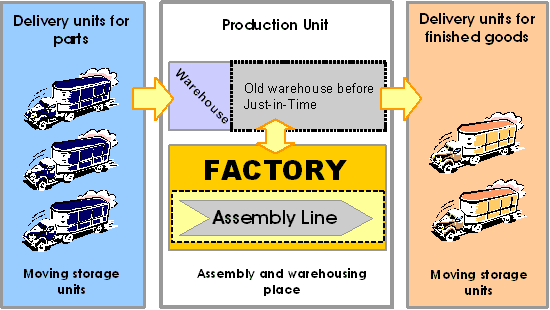 Consequently, freight forwarders must respect tighter delivery schedules and must plan their operations accordingly in order to avoid strict delay penalties. The production unit (the factory) assumes a lower level of warehousing. As a result, the trucks (vehicles) themselves assume the task of moving storage units, thus the inventory is constantly in circulation.